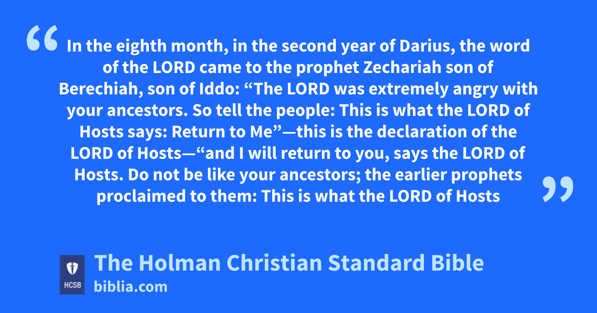 1 In the eighth month, in the second year of Darius, a the word of the Lord came to the prophet Zechariah b son of Berechiah, son of Iddo: 2 “The Lord was extremely angry with your ancestors. c 3 So tell the people: This is what the Lord of * Hosts says: Return to Me”—this is the declaration of the Lord of Hosts—“and I will return to you, says the Lord of Hosts. d 4 Do not be like your ancestors; e the earlier prophets proclaimed to them: f This is what the Lord of Hosts says: Turn from your evil ways and your evil deeds. g But they did not listen or pay attention to Me”—this is the Lord’s declaration. 5 “Where are your ancestors now? And do the prophets live forever? 6 But didn’t My words and My statutes that I commanded My servants the prophets overtake your ancestors? They repented and said: As the Lord of Hosts purposed to deal with us for our ways and deeds, so He has dealt with us.” h