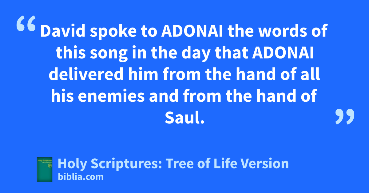 David spoke to ADONAI the words of this song in the day that ADONAI delivered him from the hand of all his enemies and from the hand of Saul.