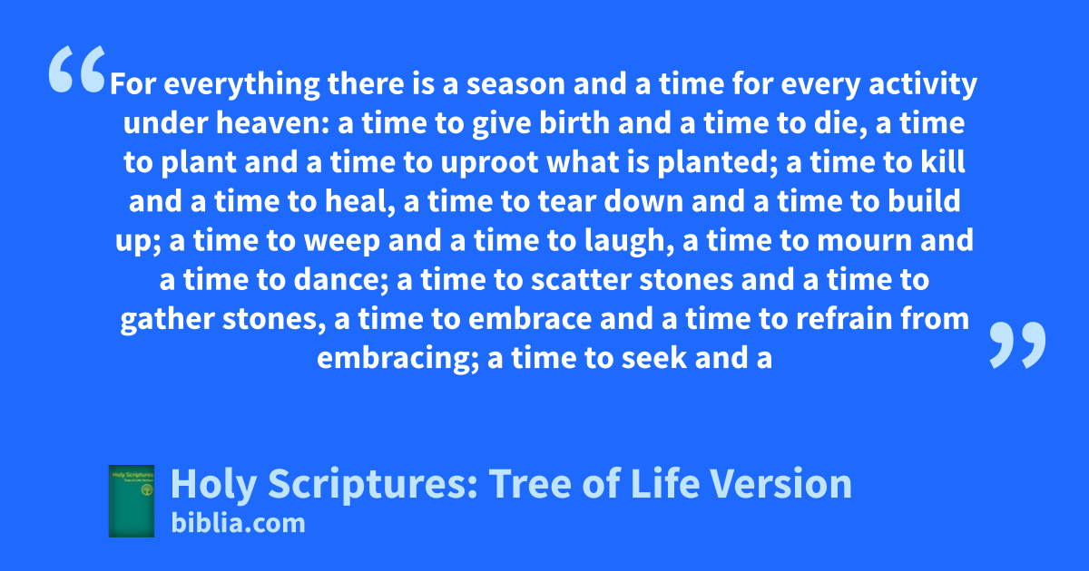 For everything there is a season and a time for every activity under heaven: a time to give birth and a time to die, a time to plant and a time to uproot what is planted; a time to kill and a time to heal, a time to tear down and a time to build up; a time to weep and a time to laugh, a time to mourn and a time to dance; a time to scatter stones and a time to gather stones, a time to embrace and a time to refrain from embracing; a time to seek and a