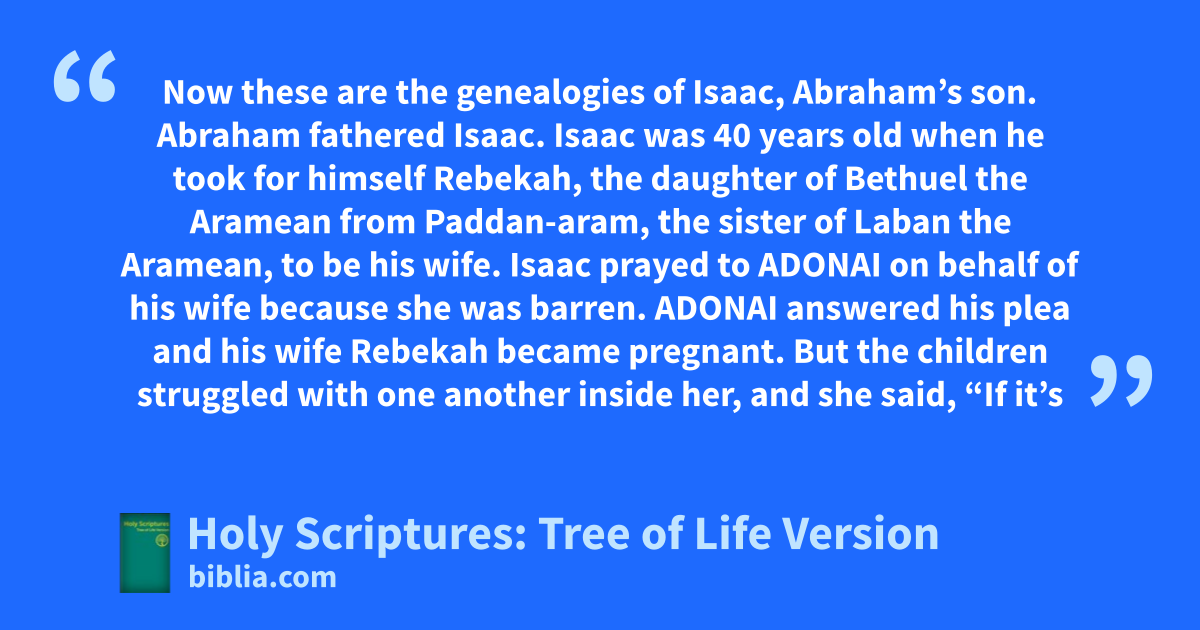Now these are the genealogies of Isaac, Abraham’s son. Abraham fathered Isaac. Isaac was 40 years old when he took for himself Rebekah, the daughter of Bethuel the Aramean from Paddan-aram, the sister of Laban the Aramean, to be his wife. Isaac prayed to ADONAI on behalf of his wife because she was barren. ADONAI answered his plea and his wife Rebekah became pregnant. But the children struggled with one another inside her, and she said, “If it’s