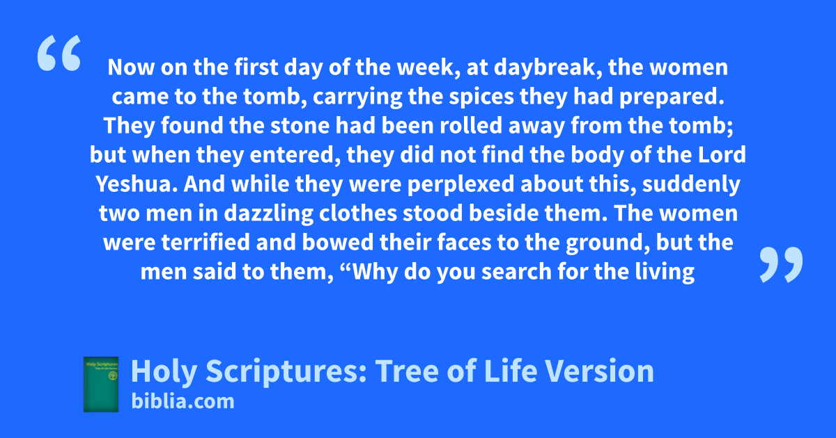 Now on the first day of the week, at daybreak, the women came to the tomb, carrying the spices they had prepared. They found the stone had been rolled away from the tomb; but when they entered, they did not find the body of the Lord Yeshua. And while they were perplexed about this, suddenly two men in dazzling clothes stood beside them. The women were terrified and bowed their faces to the ground, but the men said to them, “Why do you search for the living