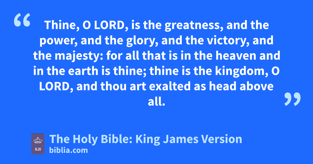10 Wherefore David blessed the LORD before all the congregation: and David said, Blessed be thou, LORD God of Israel our father, for ever and ever. 11 Thine, O LORD, is the greatness, and the power, and the glory, and the victory, and the majesty: for all that is in the heaven and in the earth is thine; thine is the kingdom, O LORD, and thou art exalted as head above all. 12 Both riches and honour come of thee, and thou reignest over all; and in thine hand is power and might; and in thine hand it is to make great, and to give strength unto all. 13 Now therefore, our God, we thank thee, and praise thy glorious name. 14 But who am I, and what is my people, that we should be ableb to offer so willingly after this sort? for all things come of thee, and of thine own have we given thee. 15 For we are strangers before thee, and sojourners, as were all our fathers: our days on the earth are as a shadow, and there is none abidingc. 16 O LORD our God, all this store that we have prepared to build thee an house for thine holy name cometh of thine hand, and is all thine own. 17 I know also, my God, that thou triest the heart, and hast pleasure in uprightness. As for me, in the uprightness of mine heart I have willingly offered all these things: and now have I seen with joy thy people, which are presentd here, to offer willingly unto thee. 18 O LORD God of Abraham, Isaac, and of Israel, our fathers, keep this for ever in the imagination of the thoughts of the heart of thy people, and preparee their heart unto thee: 19 And give unto Solomon my son a perfect heart, to keep thy commandments, thy testimonies, and thy statutes, and to do all these things, and to build the palace, for the which I have made provision. 20 And David said to all the congregation, Now bless the LORD your God. And all the congregation blessed the LORD God of their fathers, and bowed down their heads, and worshipped the LORD, and the king. 21 And they sacrificed sacrifices unto the LORD, and offered burnt offerings unto the LORD, on the morrow after that day, even a thousand bullocks, a thousand rams, and a thousand lambs, with their drink offerings, and sacrifices in abundance for all Israel: 22 And did eat and drink before the LORD on that day with great gladness. And they made Solomon the son of David king the second time, and anointed him unto the LORD to be the chief governor, and Zadok to be priest.