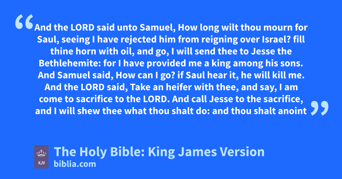 1 And the LORD said unto Samuel, How long wilt thou mourn for Saul, seeing I have rejected him from reigning over Israel? fill thine horn with oil, and go, I will send thee to Jesse the Bethlehemite: for I have provided me a king among his sons. 2 And Samuel said, How can I go? if Saul hear it, he will kill me. And the LORD said, Take an heifer with theea, and say, I am come to sacrifice to the LORD. 3 And call Jesse to the sacrifice, and I will shew thee what thou shalt do: and thou shalt anoint unto me him whom I name unto thee. 4 And Samuel did that which the LORD spake, and came to Bethlehem. And the elders of the town trembled at his coming, and said, Comest thou peaceably? 5 And he said, Peaceably: I am come to sacrifice unto the LORD: sanctify yourselves, and come with me to the sacrifice. And he sanctified Jesse and his sons, and called them to the sacrifice.