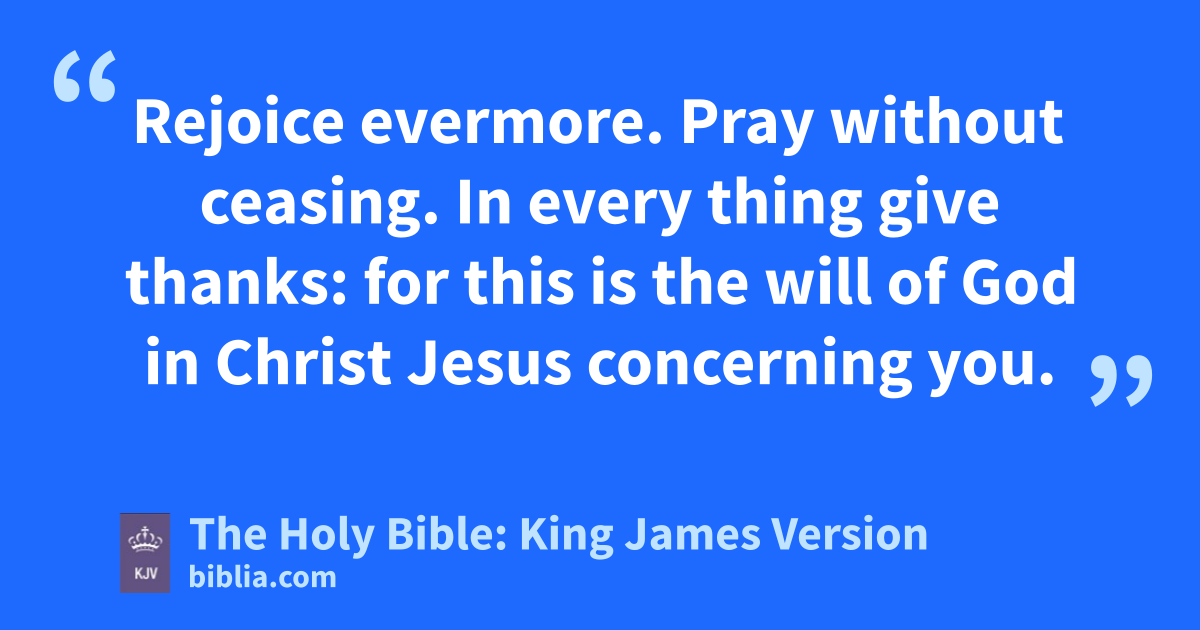 16 Rejoice evermore. 17 Pray without ceasing. 18 In every thing give thanks: for this is the will of God in Christ Jesus concerning you. 19 Quench not the Spirit. 20 Despise not prophesyings. 21 Prove all things; hold fast that which is good. 22 Abstain from all appearance of evil.