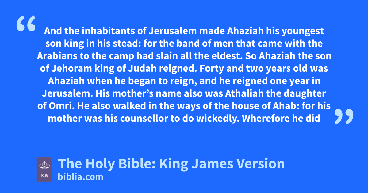 1 And the inhabitants of Jerusalem made Ahaziah his youngest son king in his stead: for the band of men that came with the Arabians to the camp had slain all the eldest. So Ahaziah the son of Jehoram king of Judah reigned. 2 Forty and two years old was Ahaziah when he began to reign, and he reigned one year in Jerusalem. His mother’s name also was Athaliah the daughter of Omri. 3 He also walked in the ways of the house of Ahab: for his mother was his counsellor to do wickedly. 4 Wherefore he did evil in the sight of the LORD like the house of Ahab: for they were his counsellors after the death of his father to his destruction. 5 He walked also after their counsel, and went with Jehoram the son of Ahab king of Israel to war against Hazael king of Syria at Ramothgilead: and the Syrians smote Joram. 6 And he returned to be healed in Jezreel because of the wounds which were given him at Ramah, when he fought with Hazael king of Syria. And Azariah the son of Jehoram king of Judah went down to see Jehoram the son of Ahab at Jezreel, because he was sick. 7 And the destructiona of Ahaziah was of God by coming to Joram: for when he was come, he went out with Jehoram against Jehu the son of Nimshi, whom the LORD had anointed to cut off the house of Ahab. 8 And it came to pass, that, when Jehu was executing judgment upon the house of Ahab, and found the princes of Judah, and the sons of the brethren of Ahaziah, that ministered to Ahaziah, he slew them. 9 And he sought Ahaziah: and they caught him, (for he was hid in Samaria,) and brought him to Jehu: and when they had slain him, they buried him: Because, said they, he is the son of Jehoshaphat, who sought the LORD with all his heart. So the house of Ahaziah had no power to keep still the kingdom.