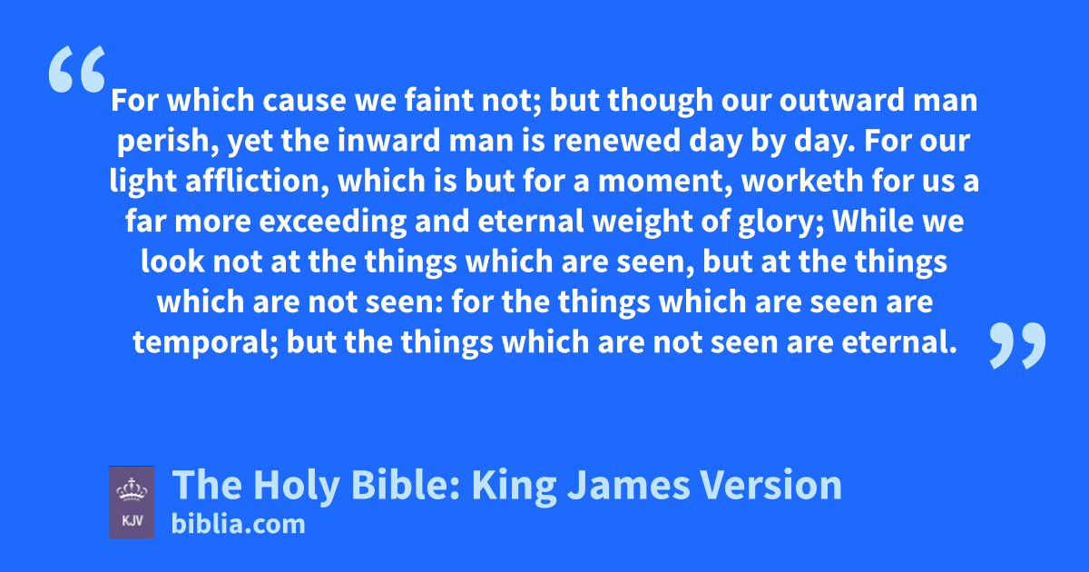 8 We are troubled on every side, yet not distressed; we are perplexed, but not in despairb; 9 Persecuted, but not forsaken; cast down, but not destroyed; 10 Always bearing about in the body the dying of the Lord Jesus, that the life also of Jesus might be made manifest in our body. 11 For we which live are alway delivered unto death for Jesus’ sake, that the life also of Jesus might be made manifest in our mortal flesh. 12 So then death worketh in us, but life in you. 13 † We having the same spirit of faith, according as it is written, I believed, and therefore have I spoken; we also believe, and therefore speak; 14 Knowing that he which raised up the Lord Jesus shall raise up us also by Jesus, and shall present us with you. 15 For all things are for your sakes, that the abundant grace might through the thanksgiving of many redound to the glory of God. 16 For which cause we faint not; but though our outward man perish, yet the inward man is renewed day by day. 17 For our light affliction, which is but for a moment, worketh for us a far more exceeding and eternal weight of glory; 18 While we look not at the things which are seen, but at the things which are not seen: for the things which are seen are temporal; but the things which are not seen are eternal.