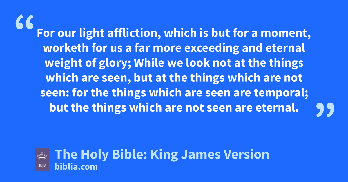 8 We are troubled on every side, yet not distressed; we are perplexed, but not in despairb; 9 Persecuted, but not forsaken; cast down, but not destroyed; 10 Always bearing about in the body the dying of the Lord Jesus, that the life also of Jesus might be made manifest in our body. 11 For we which live are alway delivered unto death for Jesus’ sake, that the life also of Jesus might be made manifest in our mortal flesh. 12 So then death worketh in us, but life in you. 13 † We having the same spirit of faith, according as it is written, I believed, and therefore have I spoken; we also believe, and therefore speak; 14 Knowing that he which raised up the Lord Jesus shall raise up us also by Jesus, and shall present us with you. 15 For all things are for your sakes, that the abundant grace might through the thanksgiving of many redound to the glory of God. 16 For which cause we faint not; but though our outward man perish, yet the inward man is renewed day by day. 17 For our light affliction, which is but for a moment, worketh for us a far more exceeding and eternal weight of glory; 18 While we look not at the things which are seen, but at the things which are not seen: for the things which are seen are temporal; but the things which are not seen are eternal.