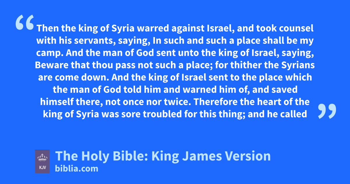 8 Then the king of Syria warred against Israel, and took counsel with his servants, saying, In such and such a place shall be my campb. 9 And the man of God sent unto the king of Israel, saying, Beware that thou pass not such a place; for thither the Syrians are come down. 10 And the king of Israel sent to the place which the man of God told him and warned him of, and saved himself there, not once nor twice. 11 Therefore the heart of the king of Syria was sore troubled for this thing; and he called his servants, and said unto them, Will ye not shew me which of us is for the king of Israel? 12 And one of his servants said, None, my lordc, O king: but Elisha, the prophet that is in Israel, telleth the king of Israel the words that thou speakest in thy bedchamber.