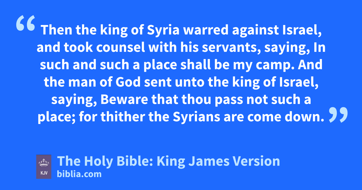 8 Then the king of Syria warred against Israel, and took counsel with his servants, saying, In such and such a place shall be my campb. 9 And the man of God sent unto the king of Israel, saying, Beware that thou pass not such a place; for thither the Syrians are come down. 10 And the king of Israel sent to the place which the man of God told him and warned him of, and saved himself there, not once nor twice. 11 Therefore the heart of the king of Syria was sore troubled for this thing; and he called his servants, and said unto them, Will ye not shew me which of us is for the king of Israel? 12 And one of his servants said, None, my lordc, O king: but Elisha, the prophet that is in Israel, telleth the king of Israel the words that thou speakest in thy bedchamber.