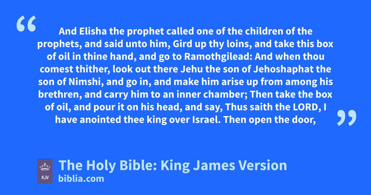 1 And Elisha the prophet called one of the children of the prophets, and said unto him, Gird up thy loins, and take this box of oil in thine hand, and go to Ramothgilead: 2 And when thou comest thither, look out there Jehu the son of Jehoshaphat the son of Nimshi, and go in, and make him arise up from among his brethren, and carry him to an innera chamber; 3 Then take the box of oil, and pour it on his head, and say, Thus saith the LORD, I have anointed thee king over Israel. Then open the door, and flee, and tarry not. 4 So the young man, even the young man the prophet, went to Ramothgilead. 5 And when he came, behold, the captains of the host were sitting; and he said, I have an errand to thee, O captain. And Jehu said, Unto which of all us? And he said, To thee, O captain. 6 And he arose, and went into the house; and he poured the oil on his head, and said unto him, Thus saith the LORD God of Israel, I have anointed thee king over the people of the LORD, even over Israel. 7 And thou shalt smite the house of Ahab thy master, that I may avenge the blood of my servants the prophets, and the blood of all the servants of the LORD, at the hand of Jezebel. 8 For the whole house of Ahab shall perish: and I will cut off from Ahab him that pisseth against the wall, and him that is shut up and left in Israel: 9 And I will make the house of Ahab like the house of Jeroboam the son of Nebat, and like the house of Baasha the son of Ahijah: 10 And the dogs shall eat Jezebel in the portion of Jezreel, and there shall be none to bury her. And he opened the door, and fled.