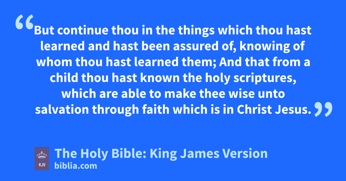 10 But thou hast fully known my doctrine, manner of life, purpose, faith, longsuffering, charity, patience, 11 Persecutions, afflictions, which came unto me at Antioch, at Iconium, at Lystra; what persecutions I endured: but out of them all the Lord delivered me. 12 Yea, and all that will live godly in Christ Jesus shall suffer persecution. 13 But evil men and seducers shall wax worse and worse, deceiving, and being deceived. 14 But continue thou in the things which thou hast learned and hast been assured of, knowing of whom thou hast learned them; 15 And that from a child thou hast known the holy scriptures, which are able to make thee wise unto salvation through faith which is in Christ Jesus. 16 All scripture is given by inspiration of God, and is profitable for doctrine, for reproof, for correction, for instruction in righteousness: 17 That the man of God may be perfect, throughly furnished unto all good works.