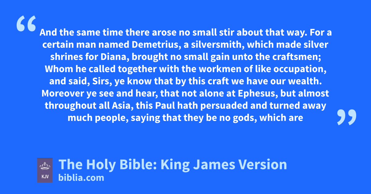 21 After these things were ended, Paul purposed in the spirit, when he had passed through Macedonia and Achaia, to go to Jerusalem, saying, After I have been there, I must also see Rome. 22 So he sent into Macedonia two of them that ministered unto him, Timotheus and Erastus; but he himself stayed in Asia for a season. 23 And the same time there arose no small stir about that way. 24 For a certain man named Demetrius, a silversmith, which made silver shrines for Diana, brought no small gain unto the craftsmen; 25 Whom he called together with the workmen of like occupation, and said, Sirs, ye know that by this craft we have our wealth. 26 Moreover ye see and hear, that not alone at Ephesus, but almost throughout all Asia, this Paul hath persuaded and turned away much people, saying that they be no gods, which are made with hands: 27 So that not only this our craft is in danger to be set at noughta; but also that the temple of the great goddess Diana should be despised,† and her magnificence should be destroyed, whom all Asia and the world worshippeth. 28 And when they heard these sayings, they were full of wrath, and cried out, saying, Great is Diana of the Ephesians. 29 And the whole city was filled with confusion: and having caught Gaius and Aristarchus, men of Macedonia, Paul’s companions in travel, they rushed with one accord into the theatre. 30 And when Paul would have entered in unto the people, the disciples suffered him not. 31 And certain of the chief of Asia, which were his friends, sent unto him, desiring him that he would not adventure himself into the theatre. 32 Some therefore cried one thing, and some another: for the assembly was confused; and the more part knew not wherefore they were come together. 33 And they drew Alexander out of the multitude, the Jews putting him forward. And Alexander beckoned with the hand, and would have made his defence unto the people. 34 But when they knew that he was a Jew, all with one voice about the space of two hours cried out, Great is Diana of the Ephesians. 35 And when the townclerk had appeased the people, he said, Ye men of Ephesus, what man is there that knoweth not how that the city of the Ephesians is a worshipperb of the great goddess Diana, and of the image which fell down from Jupiter? 36 Seeing then that these things cannot be spoken against, ye ought to be quiet, and to do nothing rashly. 37 For ye have brought hither these men, which are neither robbers of churches, nor yet blasphemers of your goddess. 38 Wherefore if Demetrius, and the craftsmen which are with him, have a matter against any man, the lawc is open, and there are deputies: let them implead one another. 39 But if ye enquire any thing concerning other matters, it shall be determined in a lawfuld assembly. 40 For we are in danger to be called in question for this day’s uproar, there being no cause whereby we may give an account of this concourse. 41 And when he had thus spoken, he dismissed the assembly.