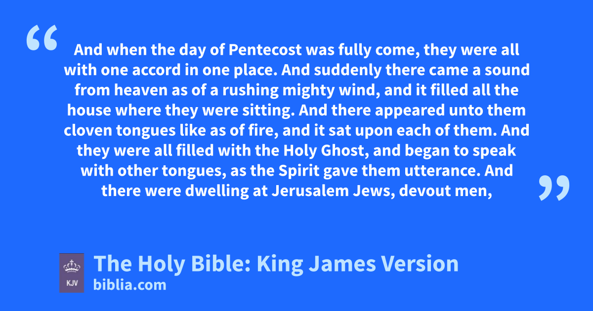 1 And when the day of Pentecost was fully come, they were all with one accord in one place. 2 And suddenly there came a sound from heaven as of a rushing mighty wind, and it filled all the house where they were sitting. 3 And there appeared unto them cloven tongues like as of fire, and it sat upon each of them. 4 And they were all filled with the Holy Ghost, and began to speak with other tongues, as the Spirit gave them utterance.