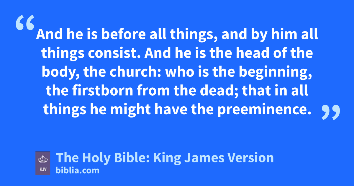 12 Giving thanks unto the Father, which hath made us meet to be partakers of the inheritance of the saints in light: 13 Who hath delivered us from the power of darkness, and hath translated us into the kingdom of hisa dear Son: 14 In whom we have redemption through his blood, even the forgiveness of sins: 15 Who is the image of the invisible God, the firstborn of every creature: 16 For by him were all things created, that are in heaven, and that are in earth, visible and invisible, whether they be thrones, or dominions, or principalities, or powers: all things were created by him, and for him: 17 And he is before all things, and by him all things consist. 18 And he is the head of the body, the church: who is the beginning, the firstborn from the dead; that inb all things he might have the preeminence. 19 For it pleased the Father that in him should all fulness dwell; 20 And, having made peace through the blood of his cross, by him to reconcile all things unto himself; by him, I say, whether they be things in earth, or things in heaven. 21 And you, that were sometime alienated and enemies in your mindc by wicked works, yet now hath he reconciled 22 In the body of his flesh through death, to present you holy and unblameable and unreproveable in his sight: 23 If ye continue in the faith grounded and settled, and be not moved away from the hope of the gospel, which ye have heard, and which was preached to every creature which is under heaven; whereof I Paul am made a minister; 24 Who now rejoice in my sufferings for you, and fill up that which is behind of the afflictions of Christ in my flesh for his body’s sake, which is the church: 25 Whereof I am made a minister, according to the dispensation of God which is given to me for you, to fulfild the word of God; 26 Even the mystery which hath been hid from ages and from generations, but now is made manifest to his saints: 27 To whom God would make known what is the riches of the glory of this mystery among the Gentiles; which is Christ ine you, the hope of glory: 28 Whom we preach, warning every man, and teaching every man in all wisdom; that we may present every man perfect in Christ Jesus: 29 Whereunto I also labour, striving according to his working, which worketh in me mightily.