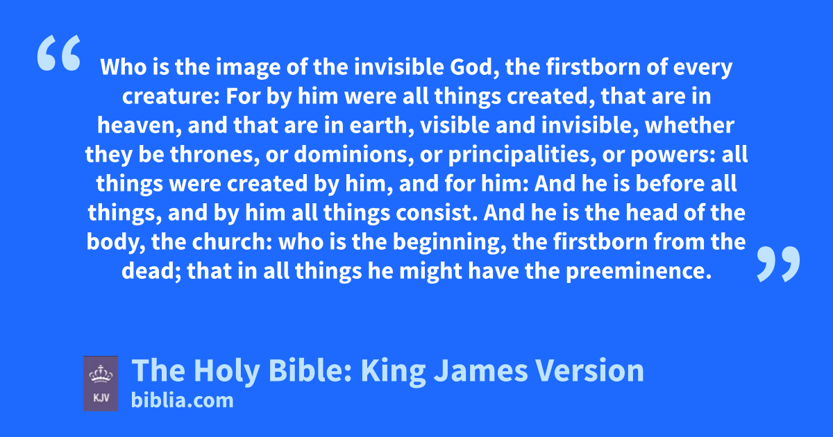 12 Giving thanks unto the Father, which hath made us meet to be partakers of the inheritance of the saints in light: 13 Who hath delivered us from the power of darkness, and hath translated us into the kingdom of hisa dear Son: 14 In whom we have redemption through his blood, even the forgiveness of sins: 15 Who is the image of the invisible God, the firstborn of every creature: 16 For by him were all things created, that are in heaven, and that are in earth, visible and invisible, whether they be thrones, or dominions, or principalities, or powers: all things were created by him, and for him: 17 And he is before all things, and by him all things consist. 18 And he is the head of the body, the church: who is the beginning, the firstborn from the dead; that inb all things he might have the preeminence. 19 For it pleased the Father that in him should all fulness dwell; 20 And, having made peace through the blood of his cross, by him to reconcile all things unto himself; by him, I say, whether they be things in earth, or things in heaven. 21 And you, that were sometime alienated and enemies in your mindc by wicked works, yet now hath he reconciled 22 In the body of his flesh through death, to present you holy and unblameable and unreproveable in his sight: 23 If ye continue in the faith grounded and settled, and be not moved away from the hope of the gospel, which ye have heard, and which was preached to every creature which is under heaven; whereof I Paul am made a minister; 24 Who now rejoice in my sufferings for you, and fill up that which is behind of the afflictions of Christ in my flesh for his body’s sake, which is the church: 25 Whereof I am made a minister, according to the dispensation of God which is given to me for you, to fulfild the word of God; 26 Even the mystery which hath been hid from ages and from generations, but now is made manifest to his saints: 27 To whom God would make known what is the riches of the glory of this mystery among the Gentiles; which is Christ ine you, the hope of glory: 28 Whom we preach, warning every man, and teaching every man in all wisdom; that we may present every man perfect in Christ Jesus: 29 Whereunto I also labour, striving according to his working, which worketh in me mightily.