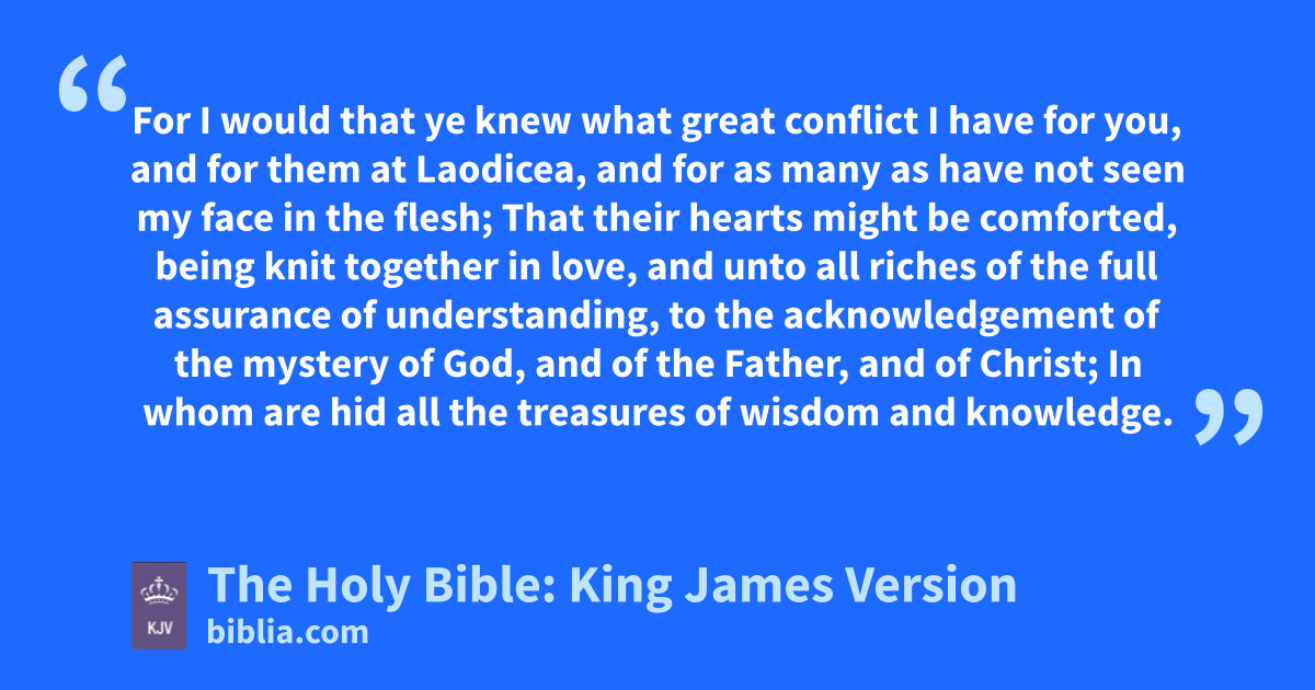 1 For I would that ye knew what great conflicta I have for you, and for them at Laodicea, and for as many as have not seen my face in the flesh; 2 That their hearts might be comforted, being knit together in love, and unto all riches of the full assurance of understanding, to the acknowledgement of the mystery of God, and of the Father, and of Christ; 3 In whomb are hid all the treasures of wisdom and knowledge.