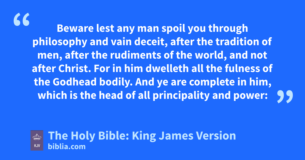 4 And this I say, lest any man should beguile you with enticing words. 5 For though I be absent in the flesh, yet am I with you in the spirit, joying and beholding your order, and the stedfastness of your faith in Christ. 6 As ye have therefore received Christ Jesus the Lord, so walk ye in him: 7 Rooted and built up in him, and stablished in the faith, as ye have been taught, abounding therein with thanksgiving. 8 Beware lest any man spoil you through philosophy and vain deceit, after the tradition of men, after the rudimentsc of the world, and not after Christ. 9 For in him dwelleth all the fulness of the Godhead bodily. 10 And ye are complete in him, which is the head of all principality and power: 11 In whom also ye are circumcised with the circumcision made without hands, in putting off the body of the sins of the flesh by the circumcision of Christ: 12 Buried with him in baptism, wherein also ye are risen with him through the faith of the operation of God, who hath raised him from the dead.