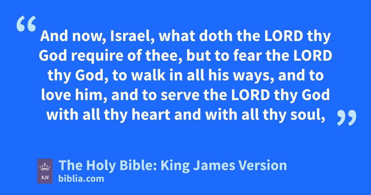 12 And now, Israel, what doth the LORD thy God require of thee, but to fear the LORD thy God, to walk in all his ways, and to love him, and to serve the LORD thy God with all thy heart and with all thy soul, 13 To keep the commandments of the LORD, and his statutes, which I command thee this day for thy good? 14 Behold, the heaven and the heaven of heavens is the LORD’S thy God, the earth also, with all that therein is. 15 Only the LORD had a delight in thy fathers to love them, and he chose their seed after them, even you above all people, as it is this day. 16 Circumcise therefore the foreskin of your heart, and be no more stiffnecked. 17 For the LORD your God is God of gods, and Lord of lords, a great God, a mighty, and a terrible, which regardeth not persons, nor taketh reward: 18 He doth execute the judgment of the fatherless and widow, and loveth the stranger, in giving him food and raiment. 19 Love ye therefore the stranger: for ye were strangers in the land of Egypt. 20 Thou shalt fear the LORD thy God; him shalt thou serve, and to him shalt thou cleave, and swear by his name. 21 He is thy praise, and he is thy God, that hath done for thee these great and terrible things, which thine eyes have seen. 22 Thy fathers went down into Egypt with threescore and ten persons; and now the LORD thy God hath made thee as the stars of heaven for multitude.