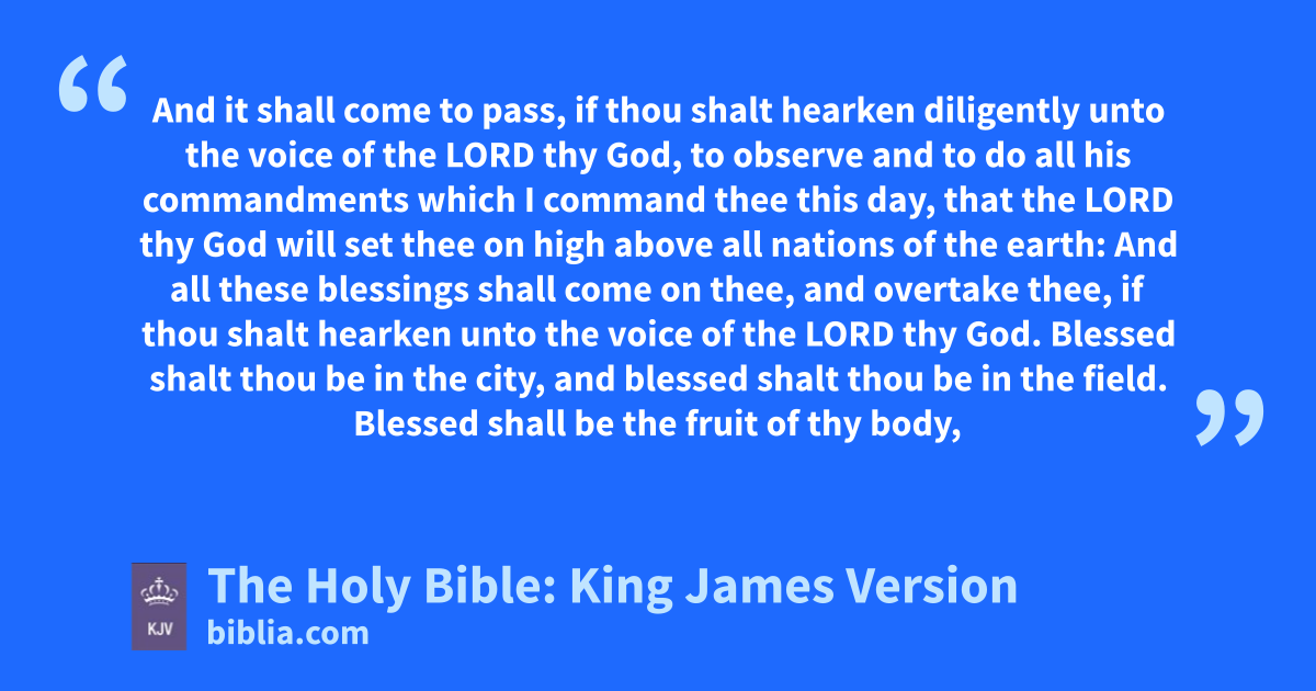 1 And it shall come to pass, if thou shalt hearken diligently unto the voice of the LORD thy God, to observe and to do all his commandments which I command thee this day, that the LORD thy God will set thee on high above all nations of the earth: 2 And all these blessings shall come on thee, and overtake thee, if thou shalt hearken unto the voice of the LORD thy God. 3 Blessed shalt thou be in the city, and blessed shalt thou be in the field. 4 Blessed shall be the fruit of thy body, and the fruit of thy ground, and the fruit of thy cattle, the increase of thy kine, and the flocks of thy sheep. 5 Blessed shall be thy basket and thy storea. 6 Blessed shalt thou be when thou comest in, and blessed shalt thou be when thou goest out. 7 The LORD shall cause thine enemies that rise up against thee to be smitten before thy face: they shall come out against thee one way, and flee before thee seven ways. 8 The LORD shall command the blessing upon thee in thy storehousesb, and in all that thou settest thine hand unto; and he shall bless thee in the land which the LORD thy God giveth thee. 9 The LORD shall establish thee an holy people unto himself, as he hath sworn unto thee, if thou shalt keep the commandments of the LORD thy God, and walk in his ways. 10 And all people of the earth shall see that thou art called by the name of the LORD; and they shall be afraid of thee. 11 And the LORD shall make thee plenteous in goodsc, in the fruit of thy body, and in the fruit of thy cattle, and in the fruit of thy ground, in the land which the LORD sware unto thy fathers to give thee. 12 The LORD shall open unto thee his good treasure, the heaven to give the rain unto thy land in his season, and to bless all the work of thine hand: and thou shalt lend unto many nations, and thou shalt not borrow. 13 And the LORD shall make thee the head, and not the tail; and thou shalt be above only, and thou shalt not be beneath; if that thou hearken unto the commandments of the LORD thy God, which I command thee this day, to observe and to do them: 14 And thou shalt not go aside from any of the words which I command thee this day, to the right hand, or to the left, to go after other gods to serve them.