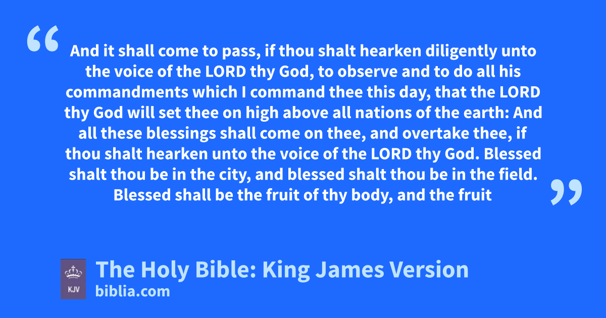 1 And it shall come to pass, if thou shalt hearken diligently unto the voice of the LORD thy God, to observe and to do all his commandments which I command thee this day, that the LORD thy God will set thee on high above all nations of the earth: 2 And all these blessings shall come on thee, and overtake thee, if thou shalt hearken unto the voice of the LORD thy God. 3 Blessed shalt thou be in the city, and blessed shalt thou be in the field. 4 Blessed shall be the fruit of thy body, and the fruit of thy ground, and the fruit of thy cattle, the increase of thy kine, and the flocks of thy sheep. 5 Blessed shall be thy basket and thy storea. 6 Blessed shalt thou be when thou comest in, and blessed shalt thou be when thou goest out. 7 The LORD shall cause thine enemies that rise up against thee to be smitten before thy face: they shall come out against thee one way, and flee before thee seven ways. 8 The LORD shall command the blessing upon thee in thy storehousesb, and in all that thou settest thine hand unto; and he shall bless thee in the land which the LORD thy God giveth thee. 9 The LORD shall establish thee an holy people unto himself, as he hath sworn unto thee, if thou shalt keep the commandments of the LORD thy God, and walk in his ways. 10 And all people of the earth shall see that thou art called by the name of the LORD; and they shall be afraid of thee. 11 And the LORD shall make thee plenteous in goodsc, in the fruit of thy body, and in the fruit of thy cattle, and in the fruit of thy ground, in the land which the LORD sware unto thy fathers to give thee. 12 The LORD shall open unto thee his good treasure, the heaven to give the rain unto thy land in his season, and to bless all the work of thine hand: and thou shalt lend unto many nations, and thou shalt not borrow. 13 And the LORD shall make thee the head, and not the tail; and thou shalt be above only, and thou shalt not be beneath; if that thou hearken unto the commandments of the LORD thy God, which I command thee this day, to observe and to do them: 14 And thou shalt not go aside from any of the words which I command thee this day, to the right hand, or to the left, to go after other gods to serve them.