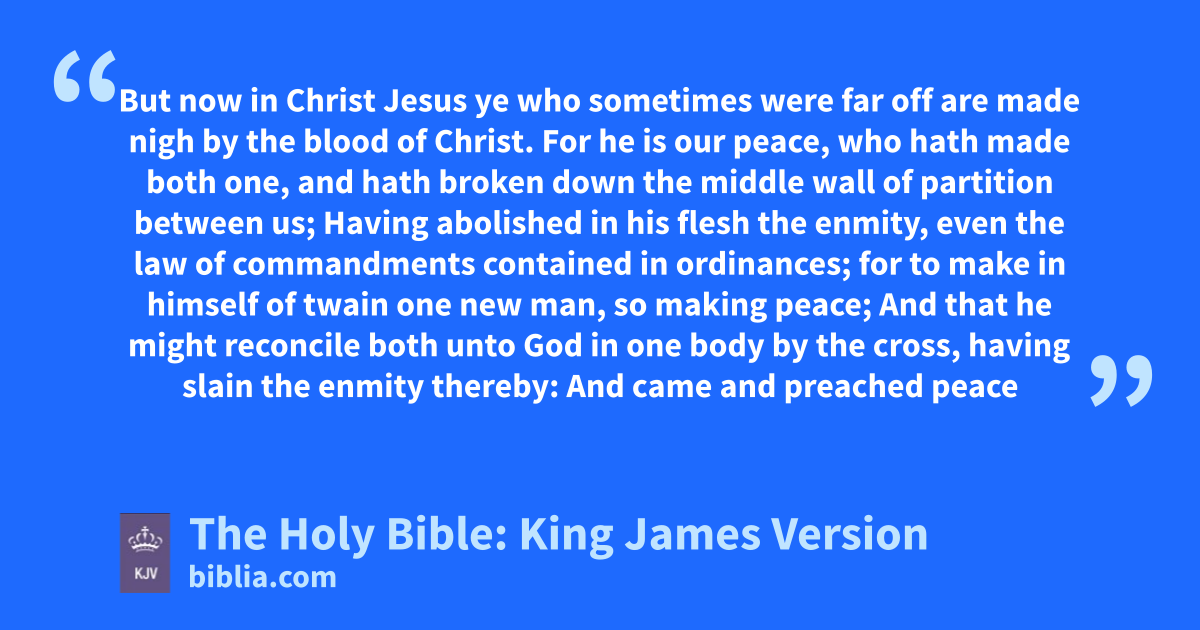 14 For he is our peace, who hath made both one, and hath broken down the middle wall of partition between us; 15 Having abolished in his flesh the enmity, even the law of commandments contained in ordinances; for to make in himself of twain one new man, so making peace; 16 And that he might reconcile both unto God in one body by the cross, having slain the enmity therebyc: 17 And came and preached peace to you which were afar off, and to them that were nigh. 18 For through him we both have access by one Spirit unto the Father. 19 Now therefore ye are no more strangers and foreigners, but fellowcitizens with the saints, and of the household of God; 20 And are built upon the foundation of the apostles and prophets, Jesus Christ himself being the chief corner stone; 21 In whom all the building fitly framed together groweth unto an holy temple in the Lord: 22 In whom ye also are builded together for an habitation of God through the Spirit.
