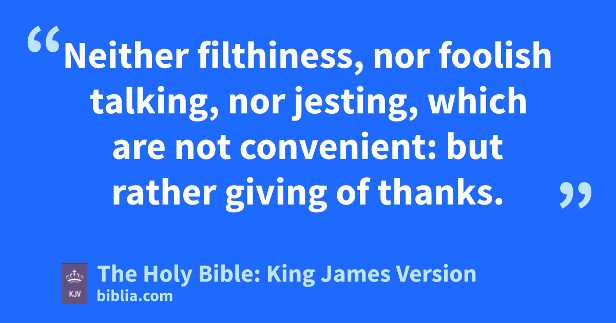3 But fornication, and all uncleanness, or covetousness, let it not be once named among you, as becometh saints; 4 Neither filthiness, nor foolish talking, nor jesting, which are not convenient: but rather giving of thanks. 5 For this ye know, that no whoremonger, nor unclean person, nor covetous man, who is an idolater, hath any inheritance in the kingdom of Christ and of God. 6 Let no man deceive you with vain words: for because of these things cometh the wrath of God upon the children of disobediencea. 7 Be not ye therefore partakers with them. 8 For ye were sometimes darkness, but now are ye light in the Lord: walk as children of light: 9 (For the fruit of the Spirit is in all goodness and righteousness and truth;) 10 Proving what is acceptable unto the Lord. 11 And have no fellowship with the unfruitful works of darkness, but rather reprove them. 12 For it is a shame even to speak of those things which are done of them in secret. 13 But all things that are reprovedb are made manifest by the light: for whatsoever doth make manifest is light. 14 Wherefore he saith, Awake thou that sleepest, and arise from the dead, and Christ shall give thee light. 15 See then that ye walk circumspectly, not as fools, but as wise, 16 Redeeming the time, because the days are evil. 17 Wherefore be ye not unwise, but understanding what the will of the Lord is. 18 And be not drunk with wine, wherein is excess; but be filled with the Spirit; 19 Speaking to yourselves in psalms and hymns and spiritual songs, singing and making melody in your heart to the Lord; 20 Giving thanks always for all things unto God and the Father in the name of our Lord Jesus Christ;