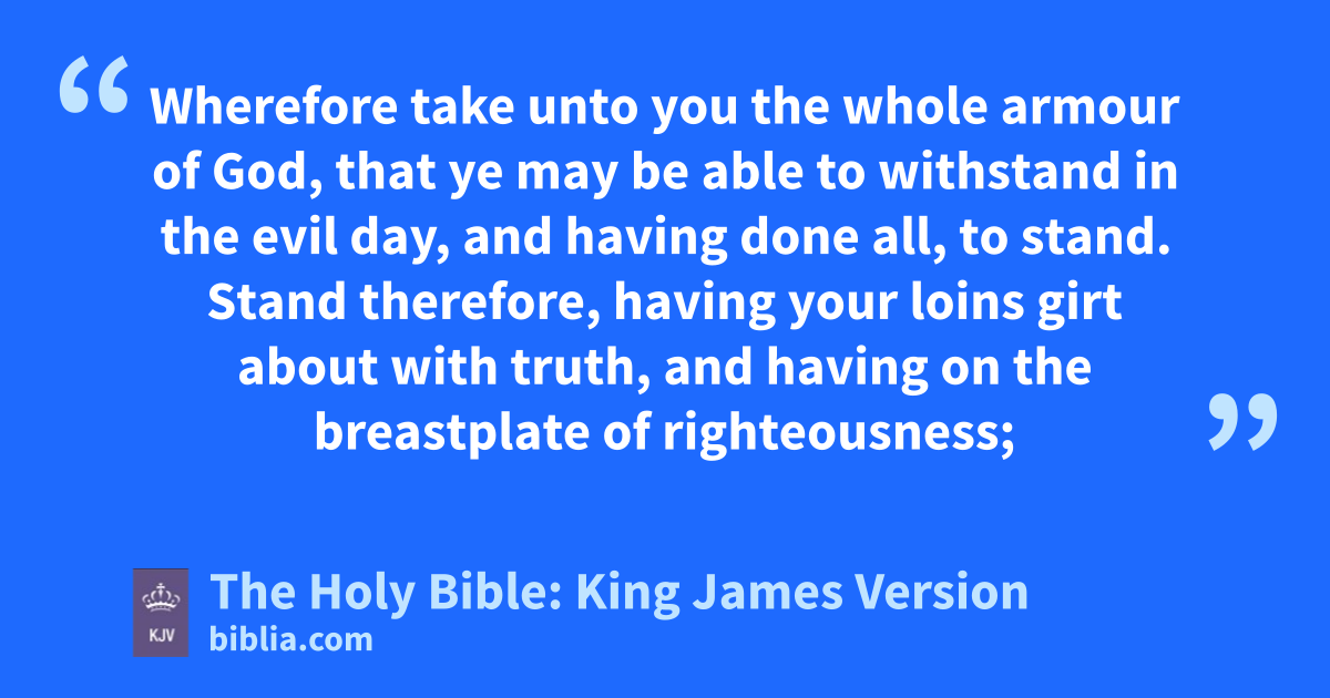 10 Finally, my brethren, be strong in the Lord, and in the power of his might. 11 Put on the whole armour of God, that ye may be able to stand against the wiles of the devil. 12 For we wrestle not against fleshb and blood, but against principalities, against powers, against the rulers of the darkness of this world, against spiritual wickedness in high places. 13 Wherefore take unto you the whole armour of God, that ye may be able to withstand in the evil day, and having done all, to stand. 14 Stand therefore, having your loins girt about with truth, and having on the breastplate of righteousness; 15 And your feet shod with the preparation of the gospel of peace; 16 Above all, taking the shield of faith, wherewith ye shall be able to quench all the fiery darts of the wicked. 17 And take the helmet of salvation, and the sword of the Spirit, which is the word of God: 18 Praying always with all prayer and supplication in the Spirit, and watching thereunto with all perseverance and supplication for all saints;