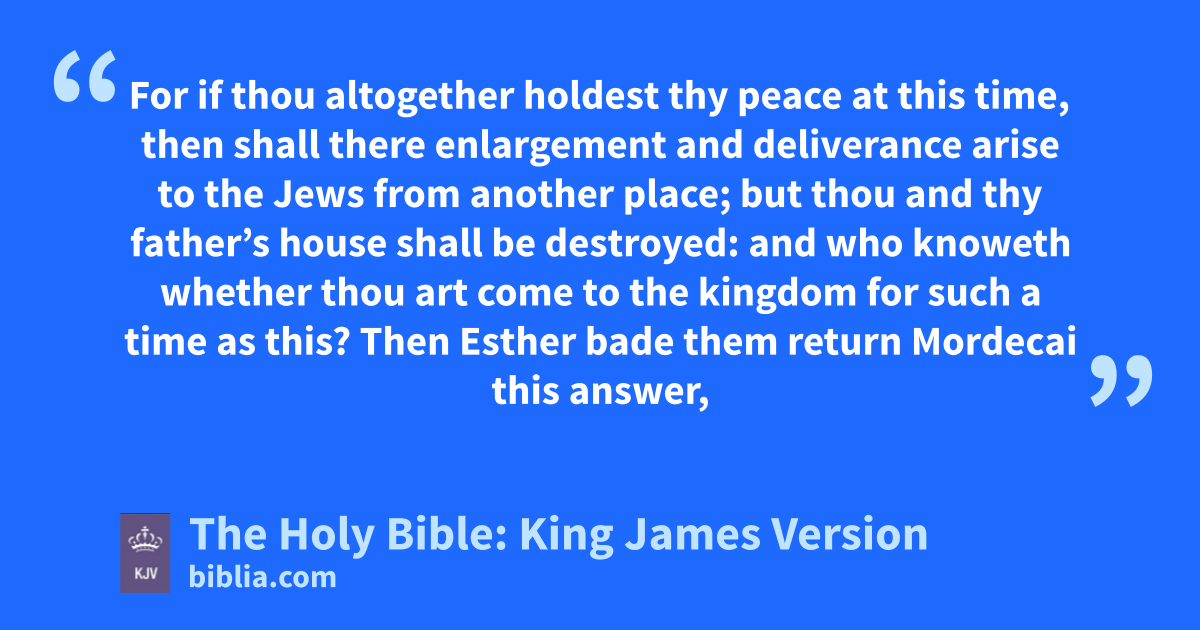 5 Then called Esther for Hatach, one of the king’s chamberlains, whom he had appointedc to attend upon her, and gave him a commandment to Mordecai, to know what it was, and why it was. 6 So Hatach went forth to Mordecai unto the street of the city, which was before the king’s gate. 7 And Mordecai told him of all that had happened unto him, and of the sum of the money that Haman had promised to pay to the king’s treasuries for the Jews, to destroy them. 8 Also he gave him the copy of the writing of the decree that was given at Shushan to destroy them, to shew it unto Esther, and to declare it unto her, and to charge her that she should go in unto the king, to make supplication unto him, and to make request before him for her people. 9 And Hatach came and told Esther the words of Mordecai. 10 Again Esther spake unto Hatach, and gave him commandment unto Mordecai; 11 All the king’s servants, and the people of the king’s provinces, do know, that whosoever, whether man or woman, shall come unto the king into the inner court, who is not called, there is one law of his to put him to death, except such to whom the king shall hold out the golden sceptre, that he may live: but I have not been called to come in unto the king these thirty days. 12 And they told to Mordecai Esther’s words. 13 Then Mordecai commanded to answer Esther, Think not with thyself that thou shalt escape in the king’s house, more than all the Jews. 14 For if thou altogether holdest thy peace at this time, then shall there enlargementd and deliverance arise to the Jews from another place; but thou and thy father’s house shall be destroyed: and who knoweth whether thou art come to the kingdom for such a time as this? 15 Then Esther bade them return Mordecai this answer, 16 Go, gather together all the Jews that are presente in Shushan, and fast ye for me, and neither eat nor drink three days, night or day: I also and my maidens will fast likewise; and so will I go in unto the king, which is not according to the law: and if I perish, I perish. 17 So Mordecai went his way, and did according to all that Esther had commanded him.