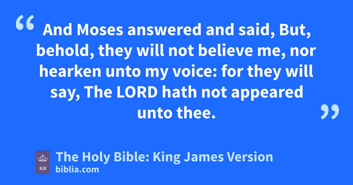 1 And Moses answered and said, But, behold, they will not believe me, nor hearken unto my voice: for they will say, The LORD hath not appeared unto thee. 2 And the LORD said unto him, What is that in thine hand? And he said, A rod. 3 And he said, Cast it on the ground. And he cast it on the ground, and it became a serpent; and Moses fled from before it. 4 And the LORD said unto Moses, Put forth thine hand, and take it by the tail. And he put forth his hand, and caught it, and it became a rod in his hand: 5 That they may believe that the LORD God of their fathers, the God of Abraham, the God of Isaac, and the God of Jacob, hath appeared unto thee. 6 And the LORD said furthermore unto him, Put now thine hand into thy bosom. And he put his hand into his bosom: and when he took it out, behold, his hand was leprous as snow. 7 And he said, Put thine hand into thy bosom again. And he put his hand into his bosom again; and plucked it out of his bosom, and, behold, it was turned again as his other flesh. 8 And it shall come to pass, if they will not believe thee, neither hearken to the voice of the first sign, that they will believe the voice of the latter sign. 9 And it shall come to pass, if they will not believe also these two signs, neither hearken unto thy voice, that thou shalt take of the water of the river, and pour it upon the dry land: and the water which thou takest out of the river shall become blood upon the dry land.