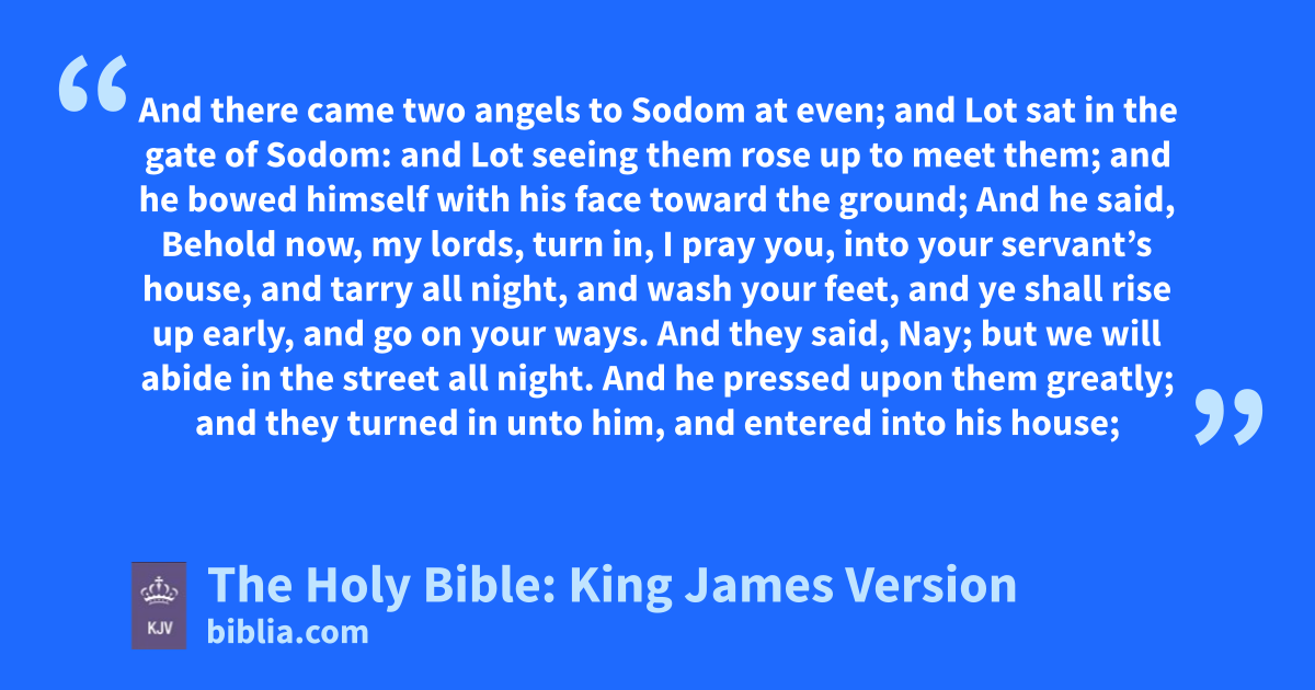 1 And there came two angels to Sodom at even; and Lot sat in the gate of Sodom: and Lot seeing them rose up to meet them; and he bowed himself with his face toward the ground; 2 And he said, Behold now, my lords, turn in, I pray you, into your servant’s house, and tarry all night, and wash your feet, and ye shall rise up early, and go on your ways. And they said, Nay; but we will abide in the street all night. 3 And he pressed upon them greatly; and they turned in unto him, and entered into his house; and he made them a feast, and did bake unleavened bread, and they did eat.
