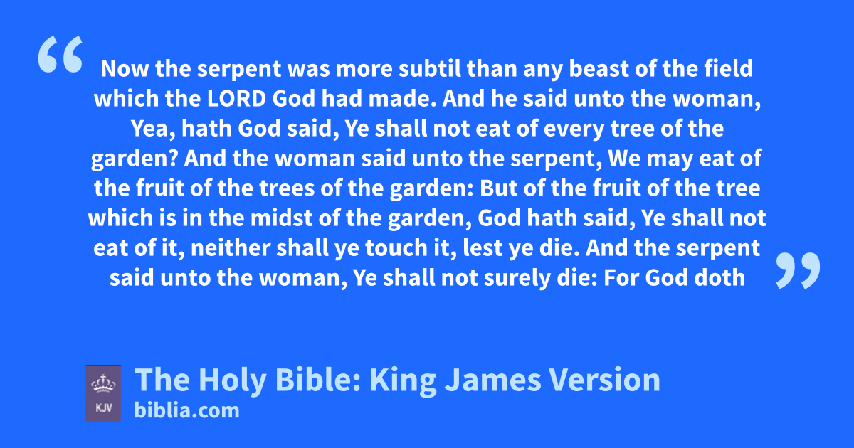1 Now the serpent was more subtil than any beast of the field which the LORD God had made. And he said unto the woman, Yeaa, hath God said, Ye shall not eat of every tree of the garden? 2 And the woman said unto the serpent, We may eat of the fruit of the trees of the garden: 3 But of the fruit of the tree which is in the midst of the garden, God hath said, Ye shall not eat of it, neither shall ye touch it, lest ye die. 4 And the serpent said unto the woman, Ye shall not surely die: 5 For God doth know that in the day ye eat thereof, then your eyes shall be opened, and ye shall be as gods, knowing good and evil.