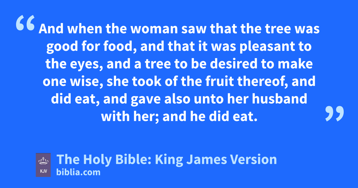 6 And when the woman saw that the tree was good for food, and that it was pleasantb to the eyes, and a tree to be desired to make one wise, she took of the fruit thereof, and did eat, and gave also unto her husband with her; and he did eat. 7 And the eyes of them both were opened, and they knew that they were naked; and they sewed fig leaves together, and made themselves apronsc. 8 And they heard the voice of the LORD God walking in the garden in the coold of the day: and Adam and his wife hid themselves from the presence of the LORD God amongst the trees of the garden.
