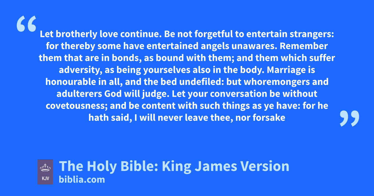 1 Let brotherly love continue. 2 Be not forgetful to entertain strangers: for thereby some have entertained angels unawares. 3 Remember them that are in bonds, as bound with them; and them which suffer adversity, as being yourselves also in the body. 4 Marriage is honourable in all, and the bed undefiled: but whoremongers and adulterers God will judge. 5 Let your conversation be without covetousness; and be content with such things as ye have: for he hath said, I will never leave thee, nor forsake thee. 6 So that we may boldly say, The Lord is my helper, and I will not fear what man shall do unto me. 7 Remember them which have the rulea over you, who have spoken unto you the word of God: whose faith follow, considering the end of their conversation. 8 Jesus Christ the same yesterday, and to day, and for ever. 9 Be not carried about with divers and strange doctrines. For it is a good thing that the heart be established with grace; not with meats, which have not profited them that have been occupied therein. 10 We have an altar, whereof they have no right to eat which serve the tabernacle. 11 For the bodies of those beasts, whose blood is brought into the sanctuary by the high priest for sin, are burned without the camp. 12 Wherefore Jesus also, that he might sanctify the people with his own blood, suffered without the gate. 13 Let us go forth therefore unto him without the camp, bearing his reproach. 14 For here have we no continuing city, but we seek one to come. 15 By him therefore let us offer the sacrifice of praise to God continually, that is, the fruit of our lips giving thanks to his name. 16 But to do good and to communicate forget not: for with such sacrifices God is well pleased. 17 Obey them that have the rule over you, and submit yourselves: for they watch for your souls, as they that must give account, that they may do it with joy, and not with grief: for that is unprofitable for you.
