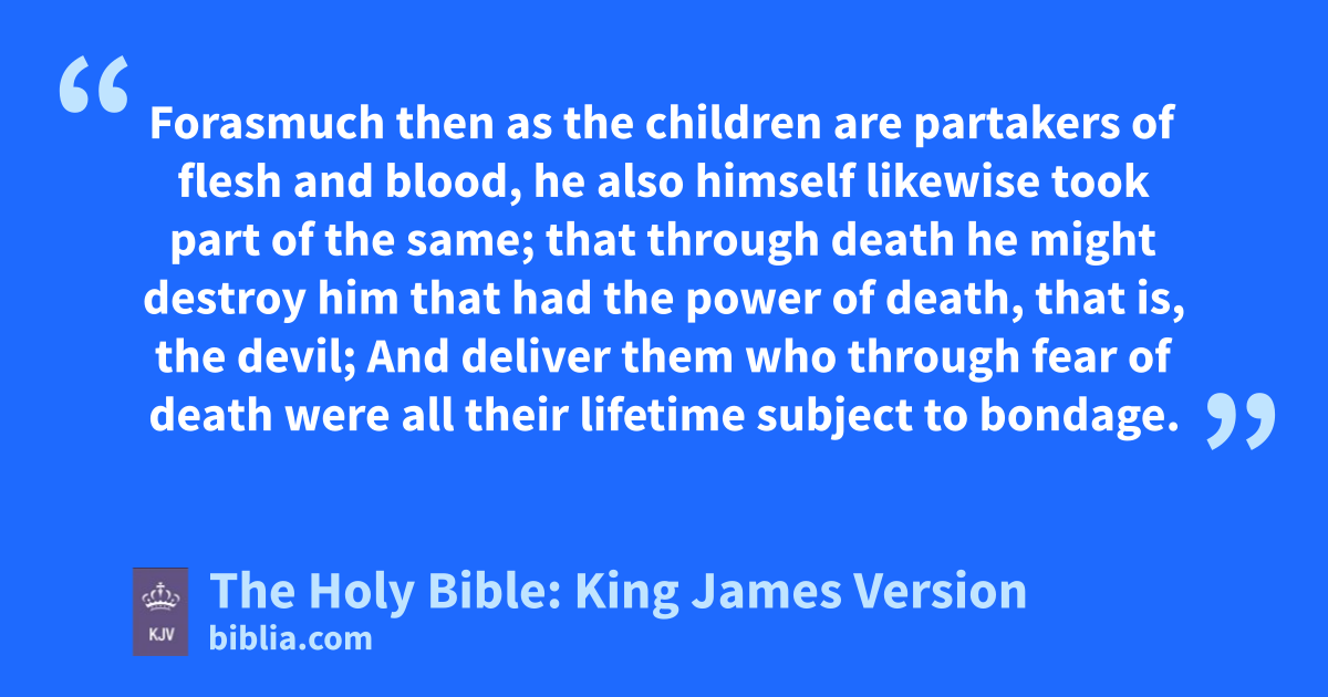 14 Forasmuch then as the children are partakers of flesh and blood, he also himself likewise took part of the same; that through death he might destroy him that had the power of death, that is, the devil; 15 And deliver them who through fear of death were all their lifetime subject to bondage. 16 For verily he took notd on him the nature of angels; but he took on him the seed of Abraham. 17 Wherefore in all things it behoved him to be made like unto his brethren, that he might be a merciful and faithful high priest in things pertaining to God, to make reconciliation for the sins of the people. 18 For in that he himself hath suffered being tempted, he is able to succour them that are tempted.