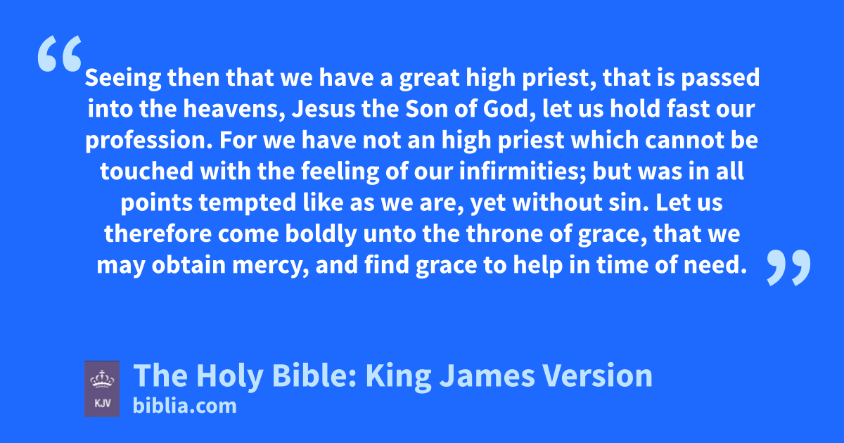 11 Let us labour therefore to enter into that rest, lest any man fall after the same example of unbeliefd. 12 For the word of God is quick, and powerful, and sharper than any twoedged sword, piercing even to the dividing asunder of soul and spirit, and of the joints and marrow, and is a discerner of the thoughts and intents of the heart. 13 Neither is there any creature that is not manifest in his sight: but all things are naked and opened unto the eyes of him with whom we have to do. 14 Seeing then that we have a great high priest, that is passed into the heavens, Jesus the Son of God, let us hold fast our profession. 15 For we have not an high priest which cannot be touched with the feeling of our infirmities; but was in all points tempted like as we are, yet without sin. 16 Let us therefore come boldly unto the throne of grace, that we may obtain mercy, and find grace to help in time of need.