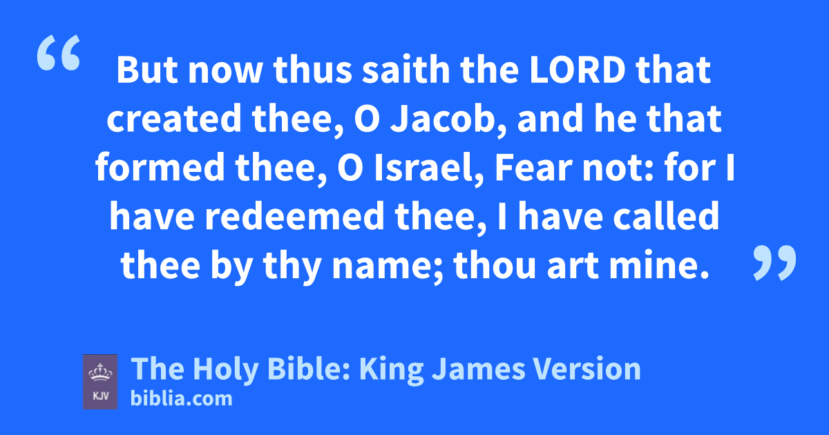 1 But now thus saith the LORD that created thee, O Jacob, and he that formed thee, O Israel, Fear not: for I have redeemed thee, I have called thee by thy name; thou art mine. 2 When thou passest through the waters, I will be with thee; and through the rivers, they shall not overflow thee: when thou walkest through the fire, thou shalt not be burned; neither shall the flame kindle upon thee. 3 For I am the LORD thy God, the Holy One of Israel, thy Saviour: I gave Egypt for thy ransom, Ethiopia and Seba for thee. 4 Since thou wast precious in my sight, thou hast been honourable, and I have loved thee: therefore will I give men for thee, and people for thy lifea. 5 Fear not: for I am with thee: I will bring thy seed from the east, and gather thee from the west; 6 I will say to the north, Give up; and to the south, Keep not back: bring my sons from far, and my daughters from the ends of the earth; 7 Even every one that is called by my name: for I have created him for my glory, I have formed him; yea, I have made him.