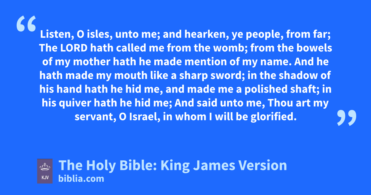 1 Listen, O isles, unto me; and hearken, ye people, from far; The LORD hath called me from the womb; from the bowels of my mother hath he made mention of my name. 2 And he hath made my mouth like a sharp sword; in the shadow of his hand hath he hid me, and made me a polished shaft; in his quiver hath he hid me; 3 And said unto me, Thou art my servant, O Israel, in whom I will be glorified. 4 Then I said, I have laboured in vain, I have spent my strength for nought, and in vain: yet surely my judgment is with the LORD, and my worka with my God. 5 And now, saith the LORD that formed me from the womb to be his servant, to bring Jacob again to him, Though Israel be not gathered, yet shall I be glorious in the eyes of the LORD, and my God shall be my strength. 6 And he said, It is a light thing that thou shouldest be my servant to raise up the tribes of Jacob, and to restore the preserved of Israel: I will also give thee for a light to the Gentiles, that thou mayest be my salvation unto the end of the earth.