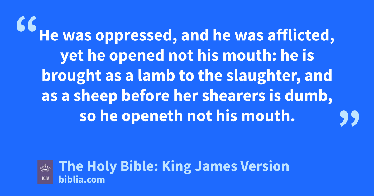 4 Surely he hath borne our griefs, and carried our sorrows: yet we did esteem him stricken, smitten of God, and afflicted. 5 But he was woundedb for our transgressions, he was bruised for our iniquities: the chastisement of our peace was upon him; and with his stripes we are healed. 6 All we like sheep have gone astray; we have turned every one to his own way; and the LORD hath laidc on him the iniquity of us all. 7 He was oppressed, and he was afflicted, yet he opened not his mouth: he is brought as a lamb to the slaughter, and as a sheep before her shearers is dumb, so he openeth not his mouth. 8 He was taken from prisond and from judgment: and who shall declare his generation? for he was cut off out of the land of the living: for the transgression of my people was he stricken. 9 And he made his grave with the wicked, and with the rich in his deathe; because he had done no violence, neither was any deceit in his mouth.