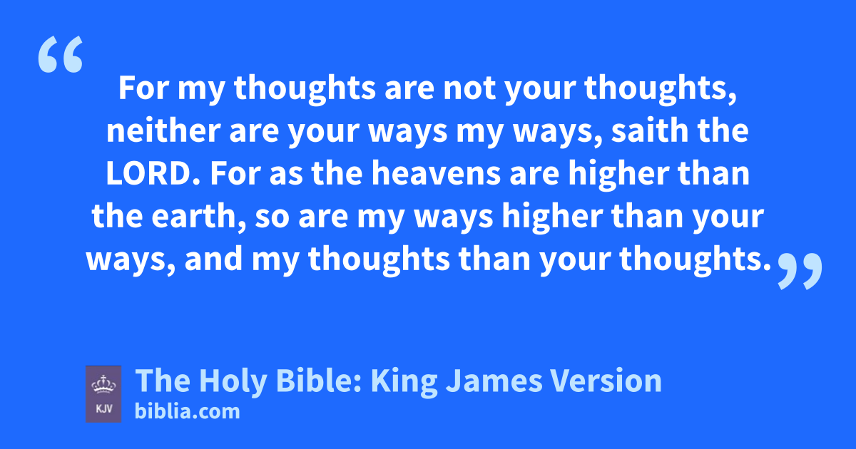 6 Seek ye the LORD while he may be found, call ye upon him while he is near: 7 Let the wicked forsake his way, and the unrighteousb man his thoughts: and let him return unto the LORD, and he will have mercy upon him; and to our God, for he will abundantly pardon. 8 For my thoughts are not your thoughts, neither are your ways my ways, saith the LORD. 9 For as the heavens are higher than the earth, so are my ways higher than your ways, and my thoughts than your thoughts. 10 For as the rain cometh down, and the snow from heaven, and returneth not thither, but watereth the earth, and maketh it bring forth and bud, that it may give seed to the sower, and bread to the eater: 11 So shall my word be that goeth forth out of my mouth: it shall not return unto me void, but it shall accomplish that which I please, and it shall prosper in the thing whereto I sent it. 12 For ye shall go out with joy, and be led forth with peace: the mountains and the hills shall break forth before you into singing, and all the trees of the field shall clap their hands. 13 Instead of the thorn shall come up the fir tree, and instead of the brier shall come up the myrtle tree: and it shall be to the LORD for a name, for an everlasting sign that shall not be cut off.