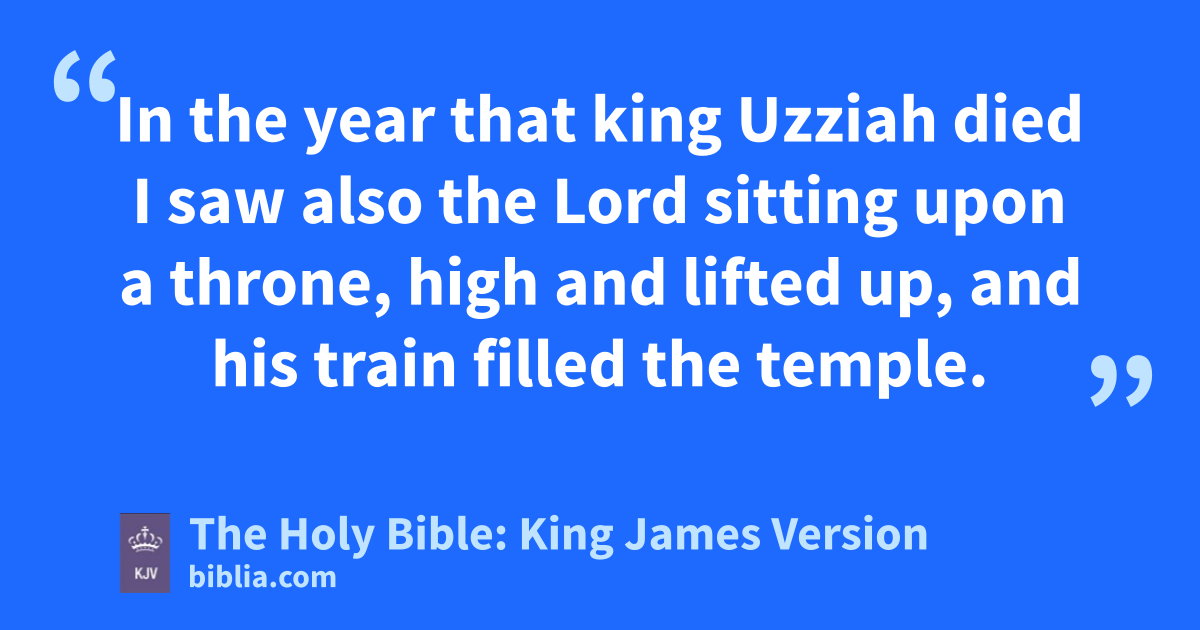 1 In the year that king Uzziah died I saw also the Lord sitting upon a throne, high and lifted up, and his train filled the temple. 2 Above it stood the seraphims: each one had six wings; with twain he covered his face, and with twain he covered his feet, and with twain he did fly. 3 And one cried unto another, and said, Holy, holy, holy, is the LORD of hosts: the whole earth is full of his glory. 4 And the posts of the doora moved at the voice of him that cried, and the house was filled with smoke.
