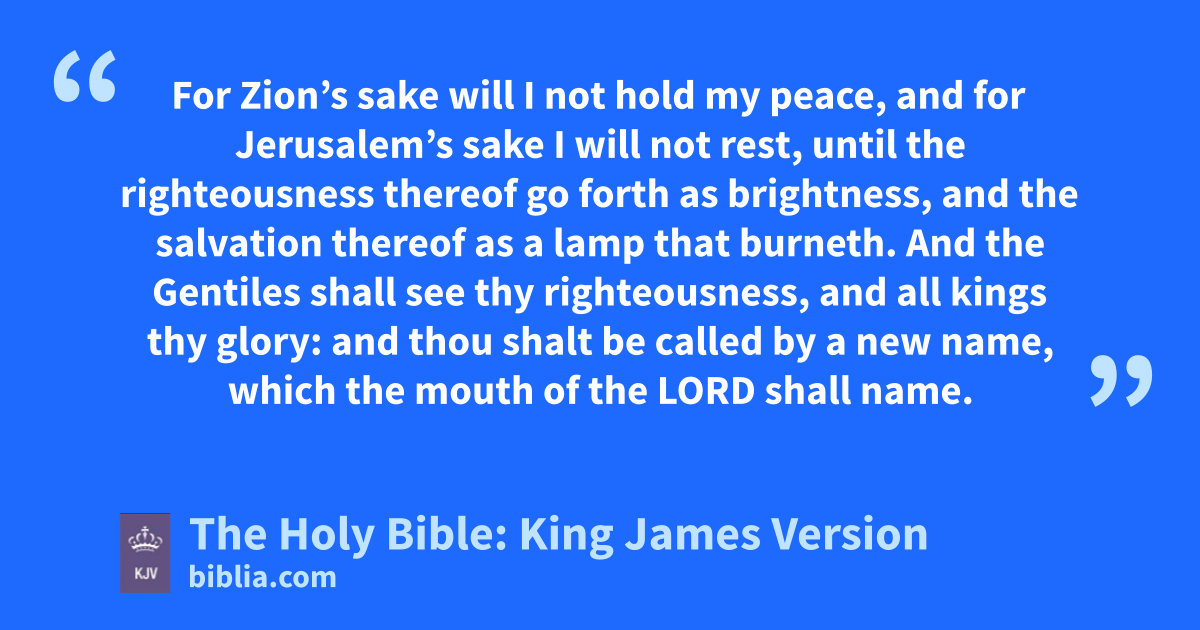 1 For Zion’s sake will I not hold my peace, and for Jerusalem’s sake I will not rest, until the righteousness thereof go forth as brightness, and the salvation thereof as a lamp that burneth. 2 And the Gentiles shall see thy righteousness, and all kings thy glory: and thou shalt be called by a new name, which the mouth of the LORD shall name. 3 Thou shalt also be a crown of glory in the hand of the LORD, and a royal diadem in the hand of thy God. 4 Thou shalt no more be termed Forsaken; neither shall thy land any more be termed Desolate: but thou shalt be called Hephzibaha, and thy land Beulah: for the LORD delighteth in thee, and thy land shall be married. 5 For as a young man marrieth a virgin, so shall thy sons marry thee: and as the bridegroom rejoiceth over the bride, so shall thy God rejoice over thee.