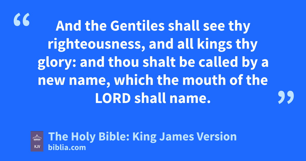 1 For Zion’s sake will I not hold my peace, and for Jerusalem’s sake I will not rest, until the righteousness thereof go forth as brightness, and the salvation thereof as a lamp that burneth. 2 And the Gentiles shall see thy righteousness, and all kings thy glory: and thou shalt be called by a new name, which the mouth of the LORD shall name. 3 Thou shalt also be a crown of glory in the hand of the LORD, and a royal diadem in the hand of thy God. 4 Thou shalt no more be termed Forsaken; neither shall thy land any more be termed Desolate: but thou shalt be called Hephzibaha, and thy land Beulah: for the LORD delighteth in thee, and thy land shall be married. 5 For as a young man marrieth a virgin, so shall thy sons marry thee: and as the bridegroom rejoiceth over the bride, so shall thy God rejoice over thee.