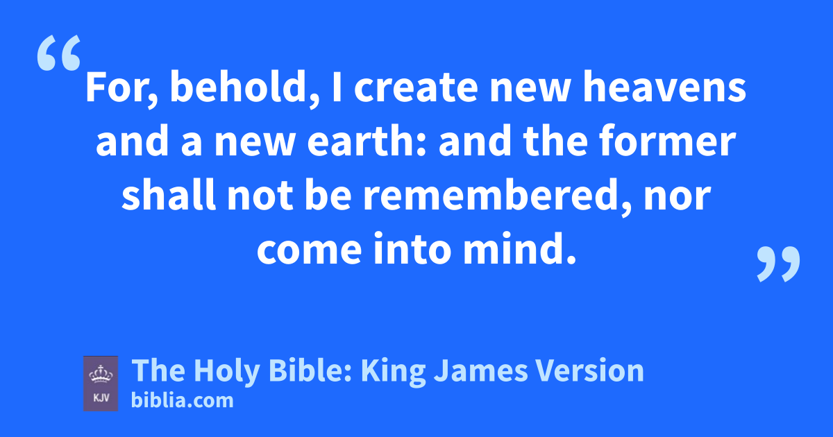 17 For, behold, I create new heavens and a new earth: and the former shall not be remembered, nor comee into mind. 18 But be ye glad and rejoice for ever in that which I create: for, behold, I create Jerusalem a rejoicing, and her people a joy. 19 And I will rejoice in Jerusalem, and joy in my people: and the voice of weeping shall be no more heard in her, nor the voice of crying. 20 There shall be no more thence an infant of days, nor an old man that hath not filled his days: for the child shall die an hundred years old; but the sinner being an hundred years old shall be accursed. 21 And they shall build houses, and inhabit them; and they shall plant vineyards, and eat the fruit of them. 22 They shall not build, and another inhabit; they shall not plant, and another eat: for as the days of a tree are the days of my people, and mine elect shall long enjoy the work of their hands. 23 They shall not labour in vain, nor bring forth for trouble; for they are the seed of the blessed of the LORD, and their offspring with them. 24 And it shall come to pass, that before they call, I will answer; and while they are yet speaking, I will hear. 25 The wolf and the lamb shall feed together, and the lion shall eat straw like the bullock: and dust shall be the serpent’s meat. They shall not hurt nor destroy in all my holy mountain, saith the LORD.
