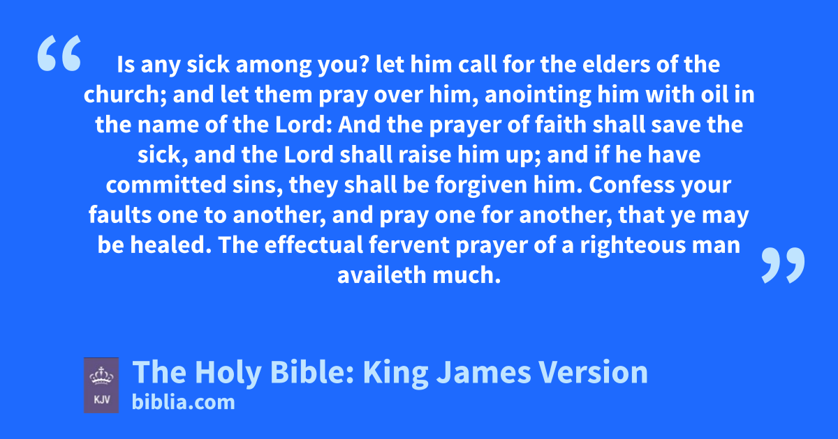12 But above all things, my brethren, swear not, neither by heaven, neither by the earth, neither by any other oath: but let your yea be yea; and your nay, nay; lest ye fall into condemnation. 13 Is any among you afflicted? let him pray. Is any merry? let him sing psalms. 14 Is any sick among you? let him call for the elders of the church; and let them pray over him, anointing him with oil in the name of the Lord: 15 And the prayer of faith shall save the sick, and the Lord shall raise him up; and if he have committed sins, they shall be forgiven him. 16 Confess your faults one to another, and pray one for another, that ye may be healed. The effectual fervent prayer of a righteous man availeth much. 17 Elias was a man subject to like passions as we are, and he prayed earnestlyb that it might not rain: and it rained not on the earth by the space of three years and six months. 18 And he prayed again, and the heaven gave rain, and the earth brought forth her fruit. 19 Brethren, if any of you do err from the truth, and one convert him; 20 Let him know, that he which converteth the sinner from the error of his way shall save a soul from death, and shall hide a multitude of sins.