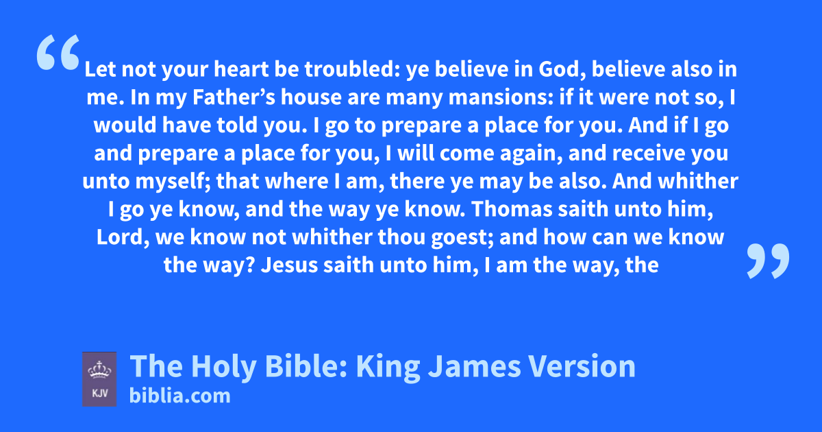 1 Let not your heart be troubled: ye believe in God, believe also in me. 2 In my Father’s house are many mansions: if it were not so, I would have told you. I go to prepare a place for you. 3 And if I go and prepare a place for you, I will come again, and receive you unto myself; that where I am, there ye may be also.