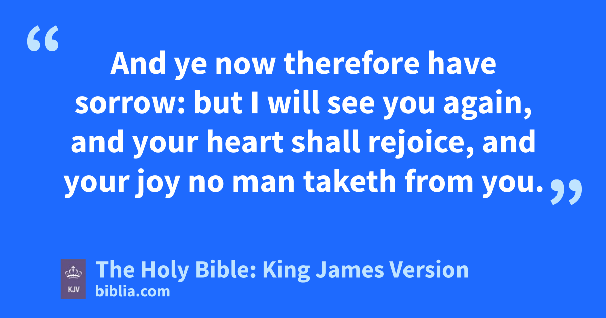 16 A little while, and ye shall not see me: and again, a little while, and ye shall see me, because I go to the Father. 17 Then said some of his disciples among themselves, What is this that he saith unto us, A little while, and ye shall not see me: and again, a little while, and ye shall see me: and, Because I go to the Father? 18 They said therefore, What is this that he saith, A little while? we cannot tell what he saith. 19 Now Jesus knew that they were desirous to ask him, and said unto them, Do ye enquire among yourselves of that I said, A little while, and ye shall not see me: and again, a little while, and ye shall see me? 20 Verily, verily, I say unto you, That ye shall weep and lament, but the world shall rejoice: and ye shall be sorrowful, but your sorrow shall be turned into joy. 21 A woman when she is in travail hath sorrow, because her hour is come: but as soon as she is delivered of the child, she remembereth no more the anguish, for joy that a man is born into the world. 22 And ye now therefore have sorrow: but I will see you again, and your heart shall rejoice, and your joy no man taketh from you.