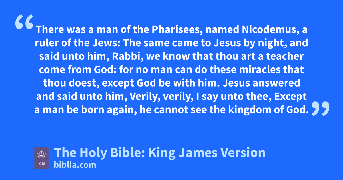 1 † There was a man of the Pharisees, named Nicodemus, a ruler of the Jews: 2 The same came to Jesus by night, and said unto him, Rabbi, we know that thou art a teacher come from God: for no man can do these miracles that thou doest, except God be with him. 3 Jesus answered and said unto him, Verily, verily, I say unto thee, Except a man be born againa, he cannot see the kingdom of God. 4 Nicodemus saith unto him, How can a man be born when he is old? can he enter the second time into his mother’s womb, and be born? 5 Jesus answered, Verily, verily, I say unto thee, Except a man be born of water and of the Spirit, he cannot enter into the kingdom of God. 6 That which is born of the flesh is flesh; and that which is born of the Spirit is spirit. 7 Marvel not that I said unto thee, Ye must be born againb. 8 The wind bloweth where it listeth, and thou hearest the sound thereof, but canst not tell whence it cometh, and whither it goeth: so is every one that is born of the Spirit. 9 Nicodemus answered and said unto him, How can these things be? 10 Jesus answered and said unto him, Art thou a master of Israel, and knowest not these things? 11 Verily, verily, I say unto thee, We speak that we do know, and testify that we have seen; and ye receive not our witness. 12 If I have told you earthly things, and ye believe not, how shall ye believe, if I tell you of heavenly things? 13 And no man hath ascended up to heaven, but he that came down from heaven, even the Son of man which is in heaven. 14 And as Moses lifted up the serpent in the wilderness, even so must the Son of man be lifted up: 15 That whosoever believeth in him should not perish, but have eternal life. 16 For God so loved the world, that he gave his only begotten Son, that whosoever believeth in him should not perish, but have everlasting life. 17 For God sent not his Son into the world to condemn the world; but that the world through him might be saved. 18 He that believeth on him is not condemned: but he that believeth not is condemned already, because he hath not believed in the name of the only begotten Son of God. 19 And this is the condemnation, that light is come into the world, and men loved darkness rather than light, because their deeds were evil. 20 For every one that doeth evil hateth the light, neither cometh to the light, lest his deeds should be reprovedc. 21 But he that doeth truth cometh to the light, that his deeds may be made manifest, that they are wrought in God.