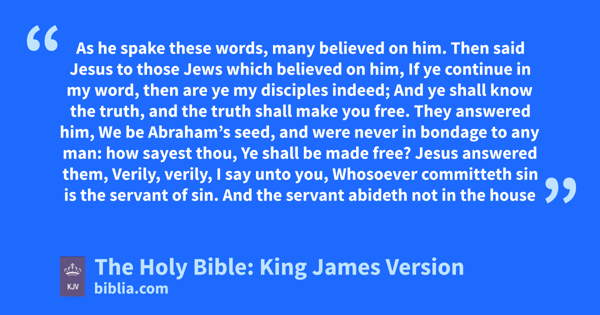 31 Then said Jesus to those Jews which believed on him, If ye continue in my word, then are ye my disciples indeed; 32 And ye shall know the truth, and the truth shall make you free. 33 They answered him, We be Abraham’s seed, and were never in bondage to any man: how sayest thou, Ye shall be made free? 34 Jesus answered them, Verily, verily, I say unto you, Whosoever committeth sin is the servant of sin. 35 And the servant abideth not in the house for ever: but the Son abideth ever. 36 If the Son therefore shall make you free, ye shall be free indeed. 37 I know that ye are Abraham’s seed; but ye seek to kill me, because my word hath no place in you.