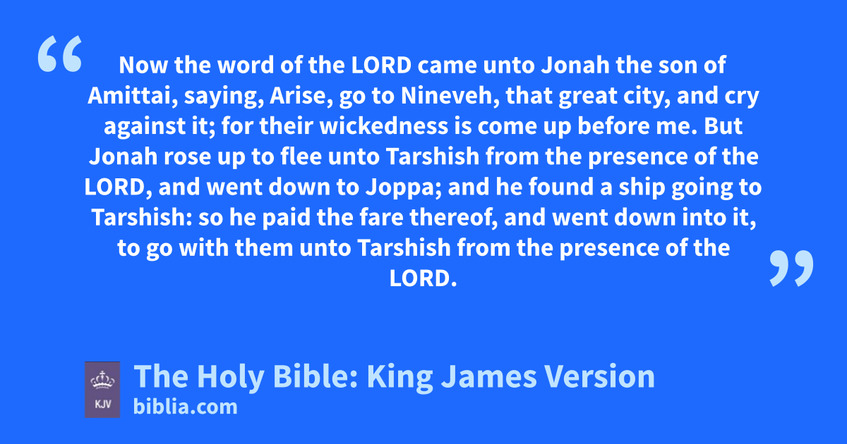 1 Now the word of the LORD came unto Jonaha the son of Amittai, saying, 2 Arise, go to Nineveh, that great city, and cry against it; for their wickedness is come up before me. 3 But Jonah rose up to flee unto Tarshish from the presence of the LORD, and went down to Joppa; and he found a ship going to Tarshish: so he paid the fare thereof, and went down into it, to go with them unto Tarshish from the presence of the LORD.