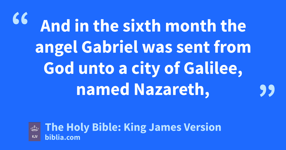 26 And in the sixth month the angel Gabriel was sent from God unto a city of Galilee, named Nazareth, 27 To a virgin espoused to a man whose name was Joseph, of the house of David; and the virgin’s name was Mary. 28 And the angel came in unto her, and said, Hail, thou that art highly favoured, the Lord is with thee: blessed art thou among women. 29 And when she saw him, she was troubled at his saying, and cast in her mind what manner of salutation this should be. 30 And the angel said unto her, Fear not, Mary: for thou hast found favour with God. 31 And, behold, thou shalt conceive in thy womb, and bring forth a son, and shalt call his name JESUS. 32 He shall be great, and shall be called the Son of the Highest: and the Lord God shall give unto him the throne of his father David: 33 And he shall reign over the house of Jacob for ever; and of his kingdom there shall be no end. 34 Then said Mary unto the angel, How shall this be, seeing I know not a man? 35 And the angel answered and said unto her, The Holy Ghost shall come upon thee, and the power of the Highest shall overshadow thee: therefore also that holy thing which shall be born of thee shall be called the Son of God. 36 And, behold, thy cousin Elisabeth, she hath also conceived a son in her old age: and this is the sixth month with her, who was called barren. 37 For with God nothing shall be impossible. 38 And Mary said, Behold the handmaid of the Lord; be it unto me according to thy word. And the angel departed from her.